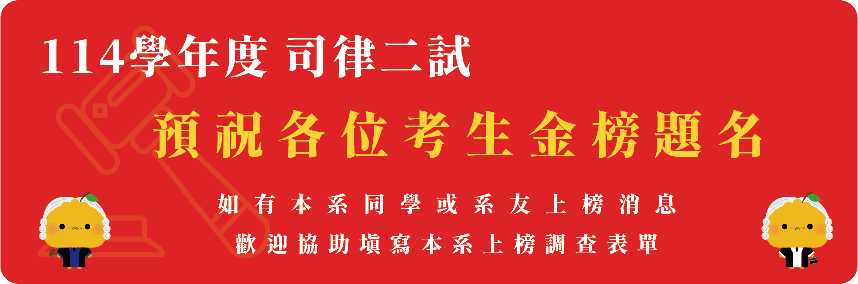 - 【期末考&自主學習】法2B民法繼承法期末考試訂於114年5月29日上午11時10分至12時50分。 請同學準時應考,並遵守考試規則! 2025-05-19