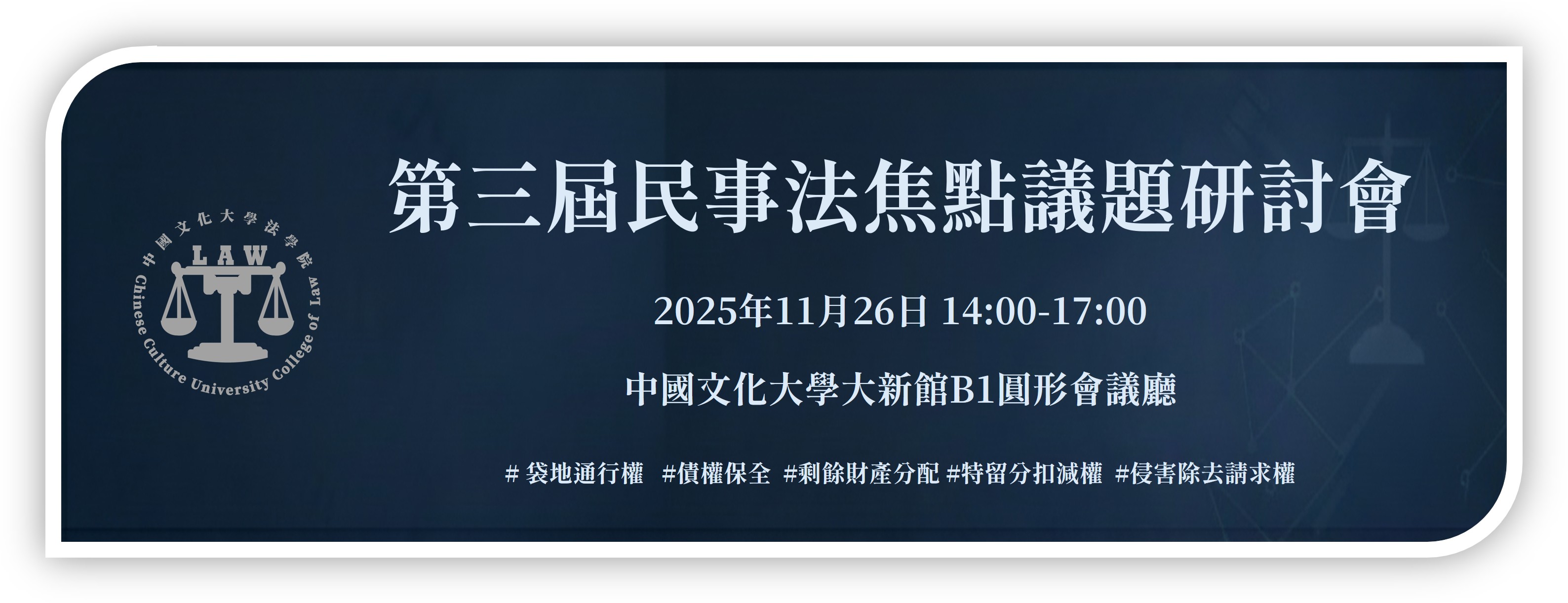 - 【學術研討會】本系民事法研究中心謹訂於114年11月26日(三)舉辦「第三屆民事法焦點議題研討會」-大新館B1圓形會議廳,歡迎踴躍報名參加。 2025-11-06
