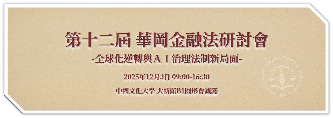 - 【學術研討會】本系財經法中心謹訂於114年12月3日(三)舉辦「第十二屆華岡金融法研討會」-大新館B1圓形會議廳,歡迎同學踴躍報名參加。 2025-11-14
