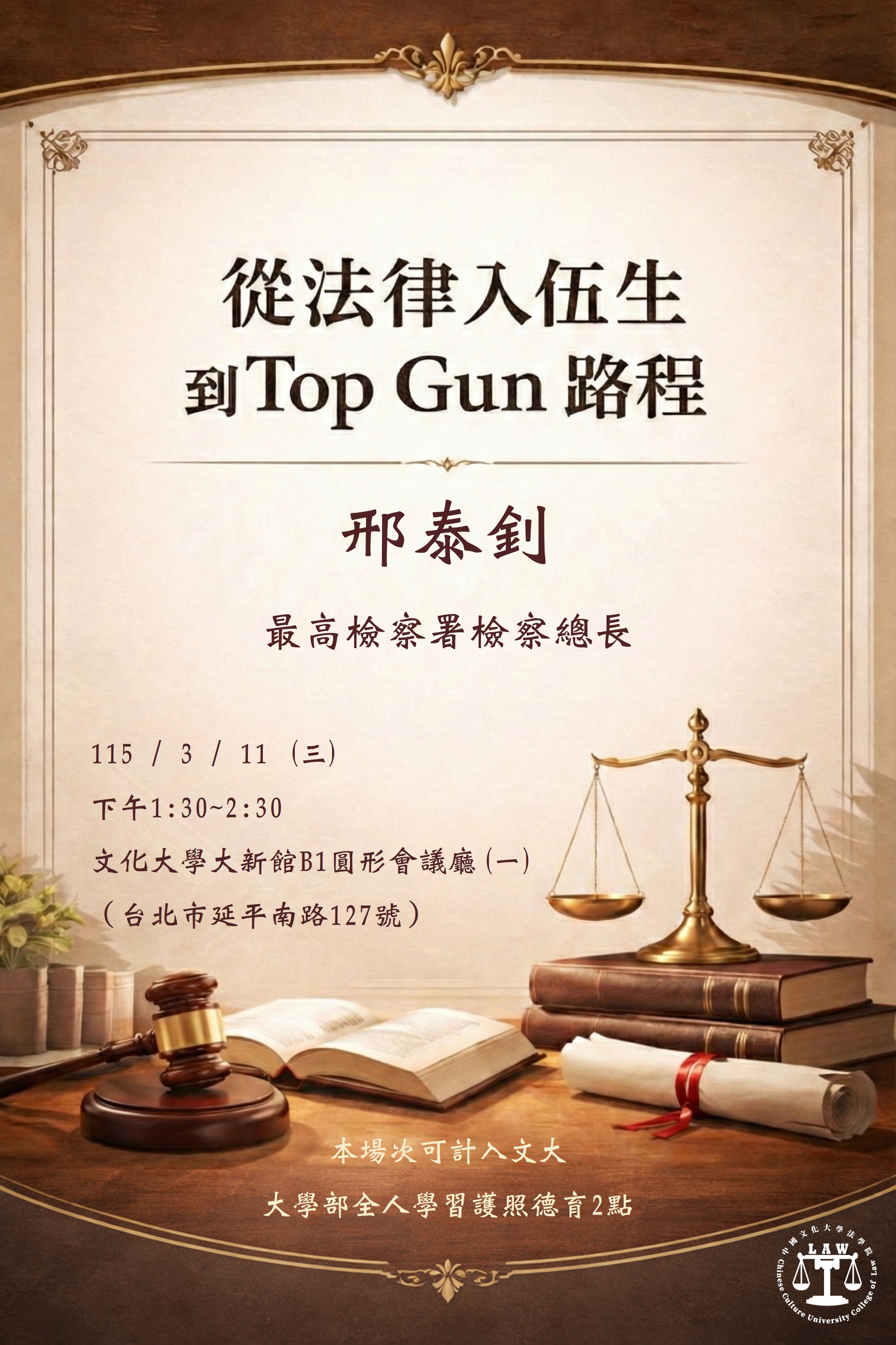 本系訂於 115年3月11日(星期三)下午1時30分至2時30分,舉辦實務講座,特別邀請 最高檢察署檢察總長 邢泰釗 蒞臨分享其從法律人到實務菁英之歷程,誠摯邀請全校師生踴躍參加。