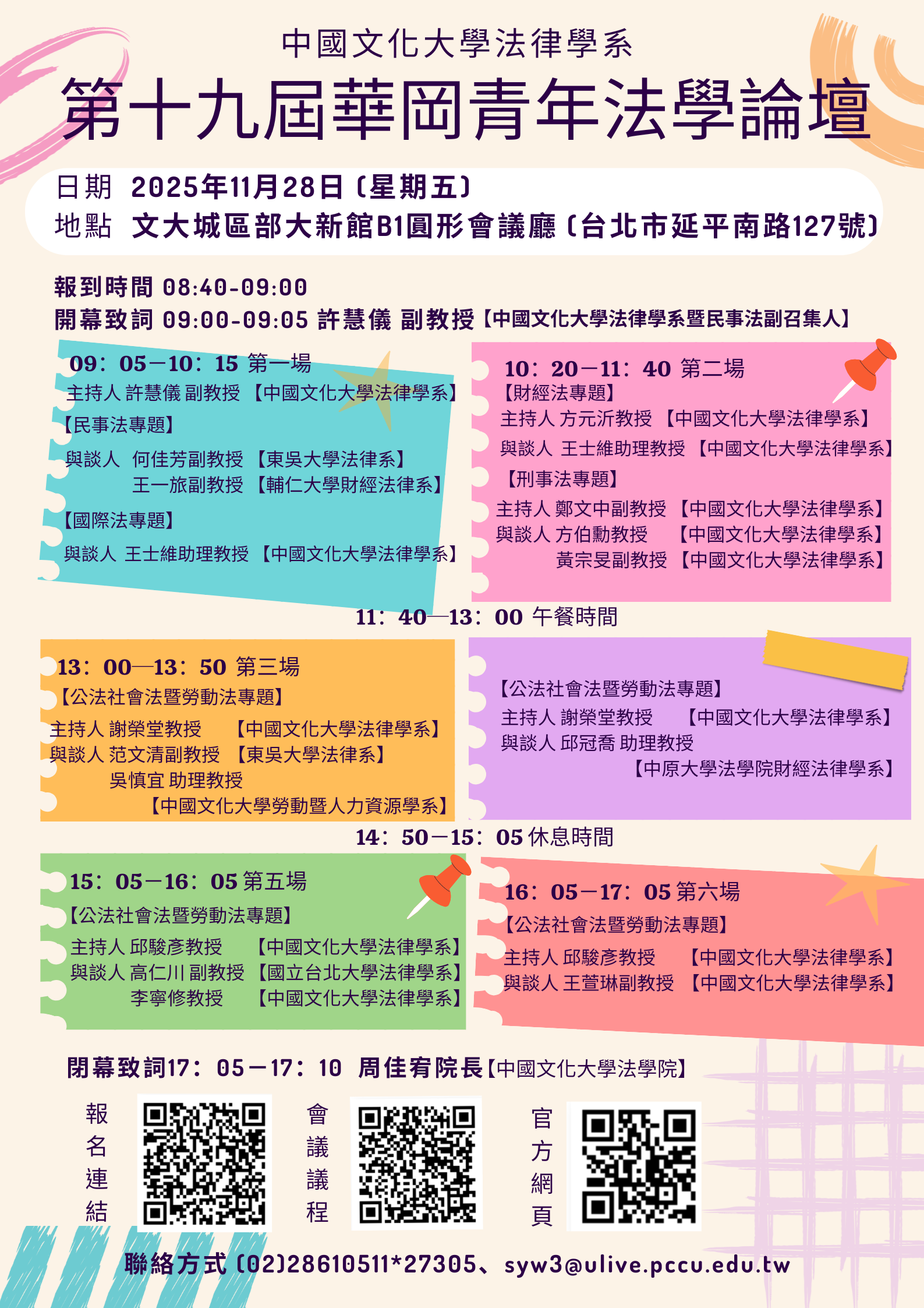 法律學系謹訂於114年11月28日(五)舉辦【第十九屆華岡青年法學論壇】,歡迎踴躍報名參加。